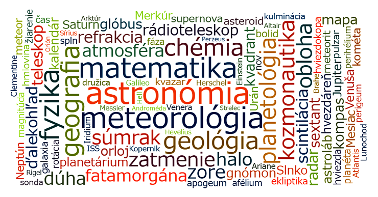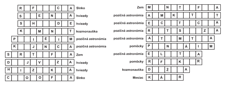 Vyhľadajte vedecké disciplíny (9), astronómov (20), atmosférické úkazy (10), súhvezdia (12), astronomické pomôcky (15), názvy hviezd (13), kozmické prostriedky (14), astronomické pojmy (18) a vesmírne objekty (22).