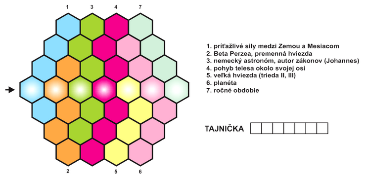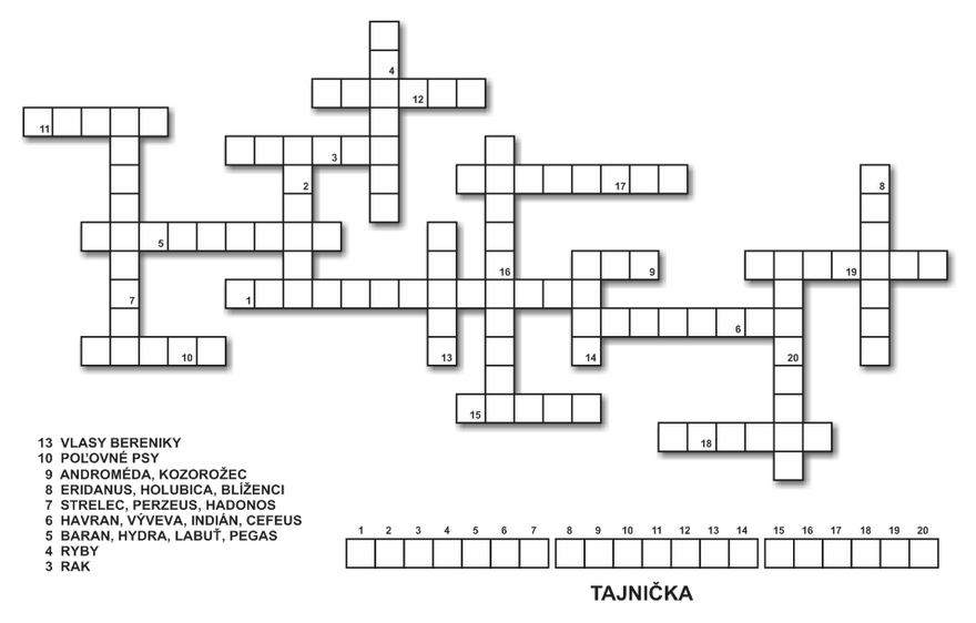 Doplňte do križovačky nasledovné súhvezdia. Tajničku získate zoradením písmen podľa čísel vo štvorčekoch.